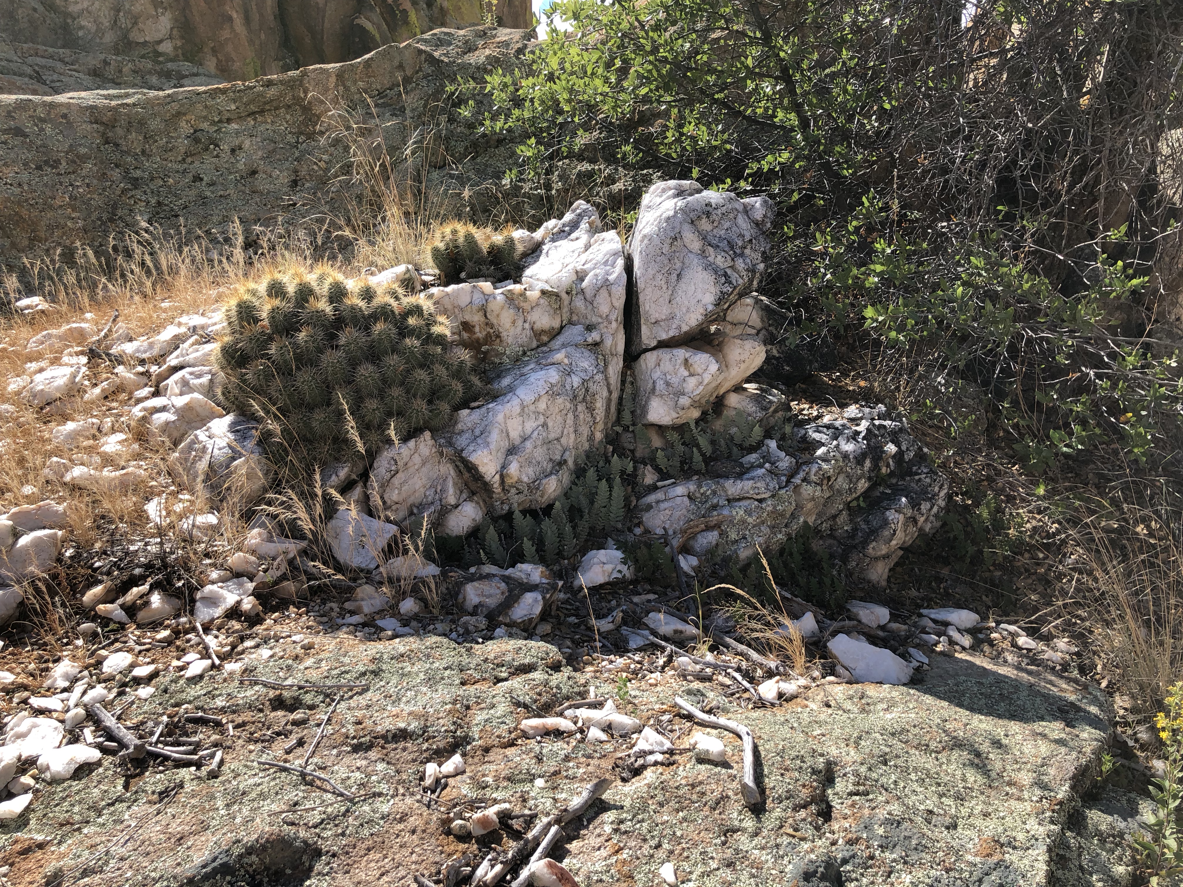 As I was running out of time, I took the Pebbles Trail as a shortcut back. (Further up was BamBam Trail, another shortcut.) This led me to Quartz Canyon. I was at a loss to understand how it got that name as all I was seeing was granite. Then I noticed a ribbon of quartz running through the granite and decided that was what the trail was named for. Boy! was I wrong! Suddenly I found myself in an area full of quartz–large and small.  From there, I reached the Easter Island Trail that would take me back to the Peavine.