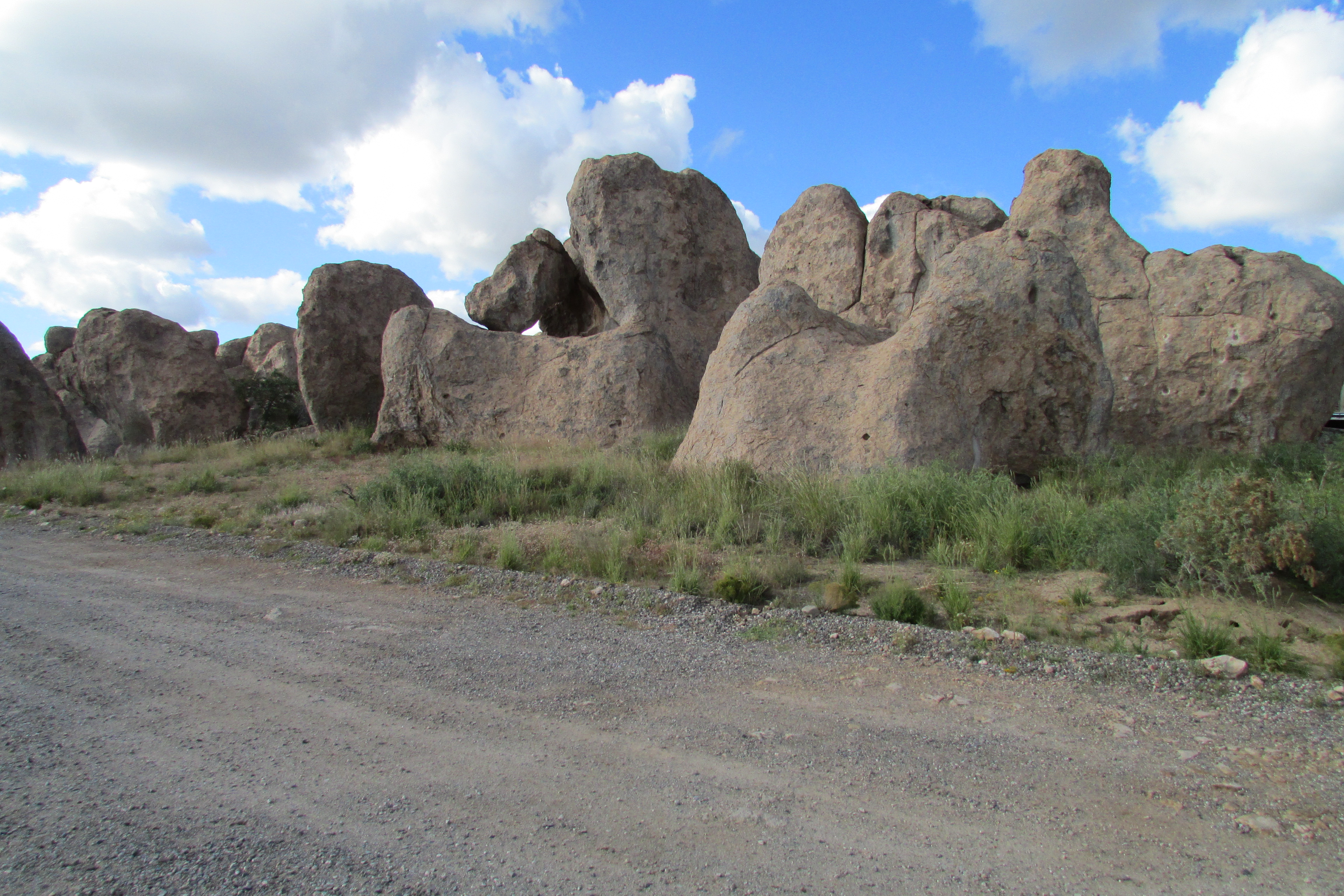 on to City of Rocks state park. It only takes a little imagination to picture Fred and Wilma coming out of one of the natural rock structures. This rock city is in the middle of a huge grassland. It appears as though some giant grew tired of carrying rocks in his pocket and dropped them on the ground. The park is a campground and some of the campsites are among the huge rocks. I had mixed feelings about that as I attempted to take pictures and avoid the huge motor homes.