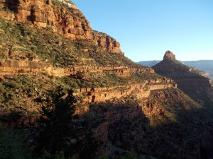 We had gone down several of the switchbacks at the beginning of DSCN0148the South Kaibab Trail when I noticed that Craig did not have his walking sticks. Our son, Mike, had seen some walking sticks leaning against the restroom at the trailhead. He offered to go back and see if they were still there. In the meantime, the rest of our party pressed on down the trail.