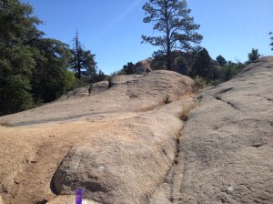 dscn0304It had rained hard the day before leaving water along the way, but most of the trail was dry.  We began our hike on the North 40, which goes along the base of the large granite formations. Then we took a newly added loop called Ham and Cheese. The trail wove through the granite rocks as if they were made of Swiss cheese, making us feel like we were part of the sandwich–Does that mean the hikers are the ham?dscn0310 Next we took a trail called the Hully Gully. A walk across the face of granite rocks (the Hully) led us to a flower-lined gully.  Our next leg of the hike was the Lost Wall. This part was steeper than the other parts of our hike. I was envious of the lizards that made it seem so easy to go  up the granite boulders. But then they do have four feet instead of two and a much lower center of gravity.